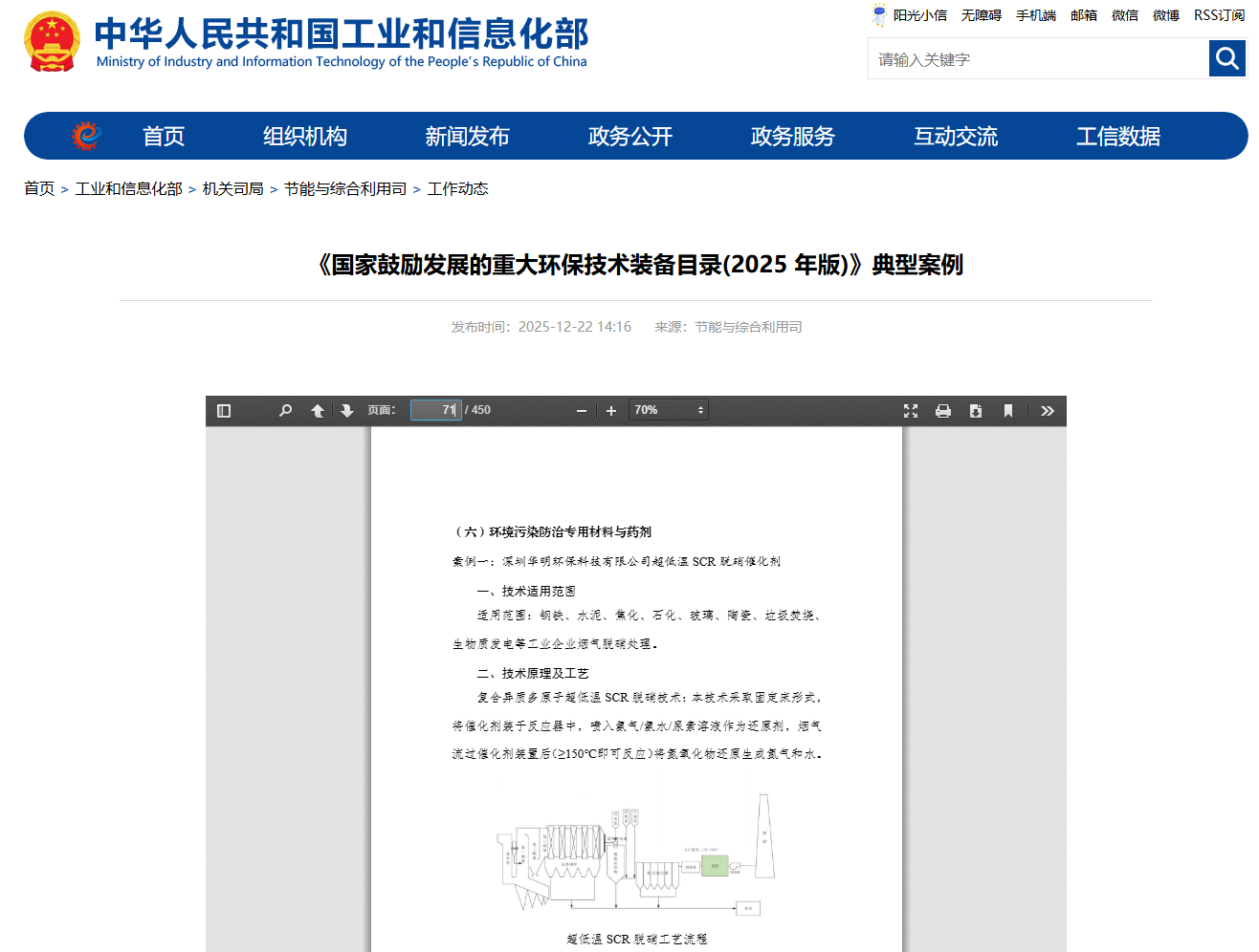 近日,工业和信息化部、生态环境部联合编制的《国家鼓励发展的重大环保技术装备目录(2025年版)》正式发布,华明环保自主研发的“超低温SCR脱硝催化剂”成功入选该目录,同时被收录为该目录“环境污染防治专用材料与药剂”的典型案例。