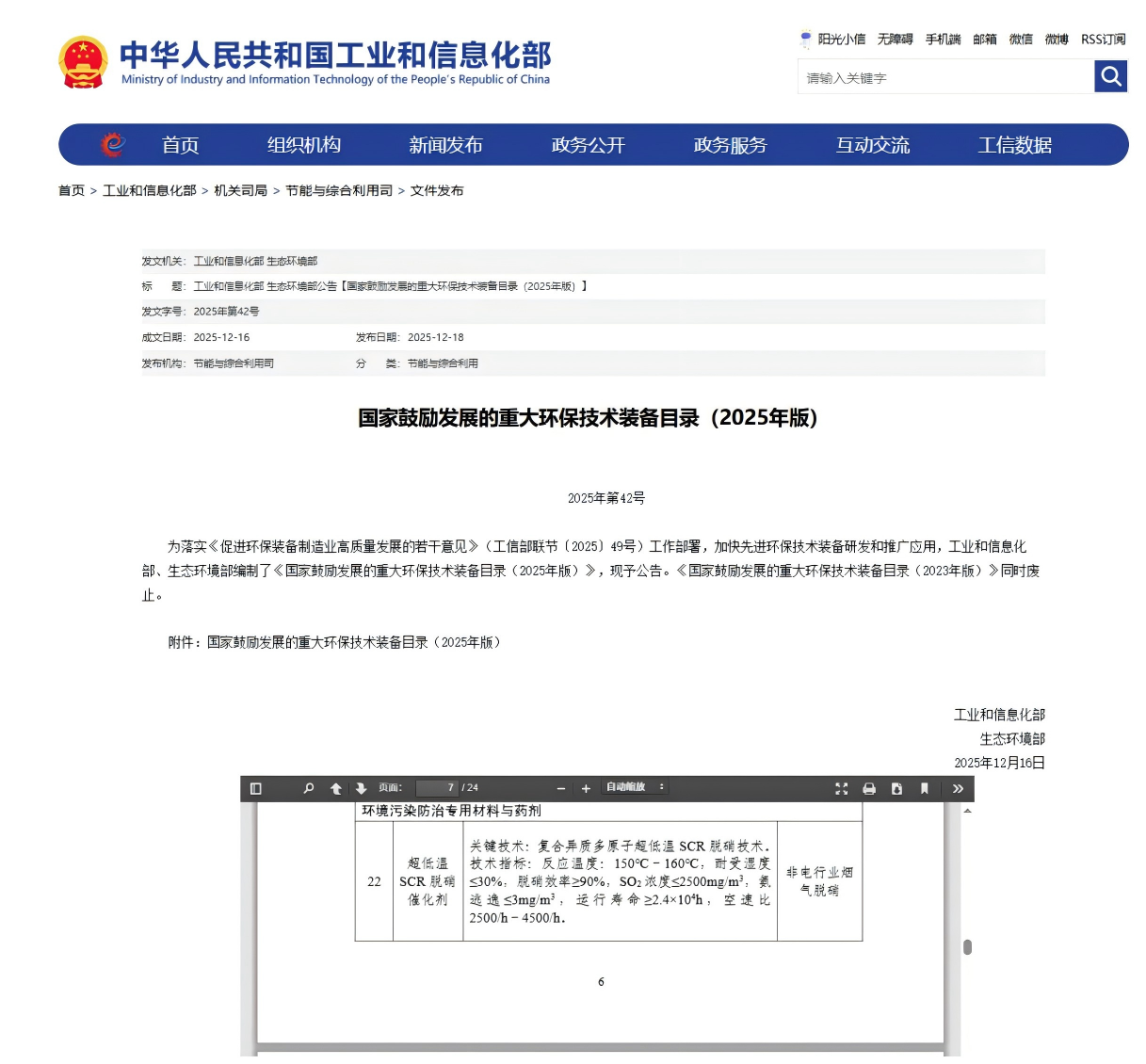 近日,工业和信息化部、生态环境部联合编制的《国家鼓励发展的重大环保技术装备目录(2025年版)》正式发布,华明环保自主研发的“超低温SCR脱硝催化剂”成功入选该目录,同时被收录为该目录“环境污染防治专用材料与药剂”的典型案例。